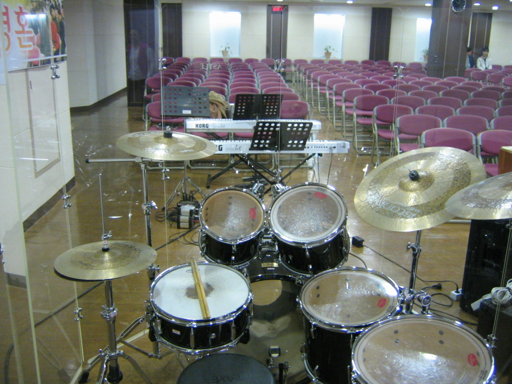 일반적으로 드럼을 교회 벽이나 구석진곳을 등지고 설치를 하는데 이곳은 벽과 꽤 떨어져서
