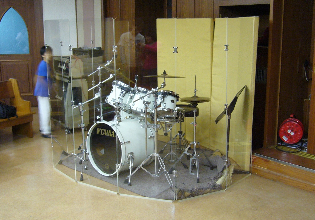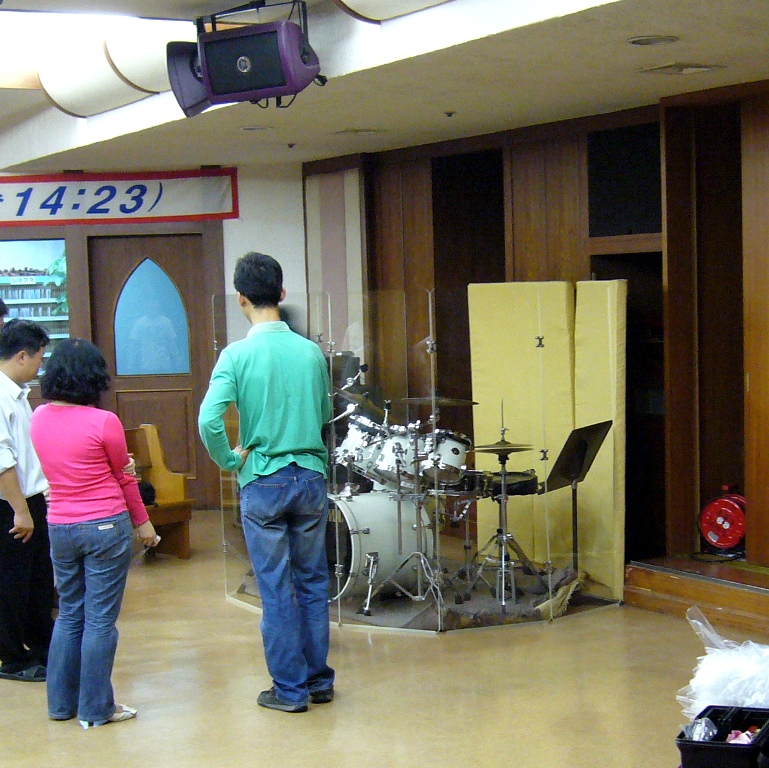 상가건물에 있는 교회들의 특징인 낮은 천장으로 드럼 소리는 뒷편까지