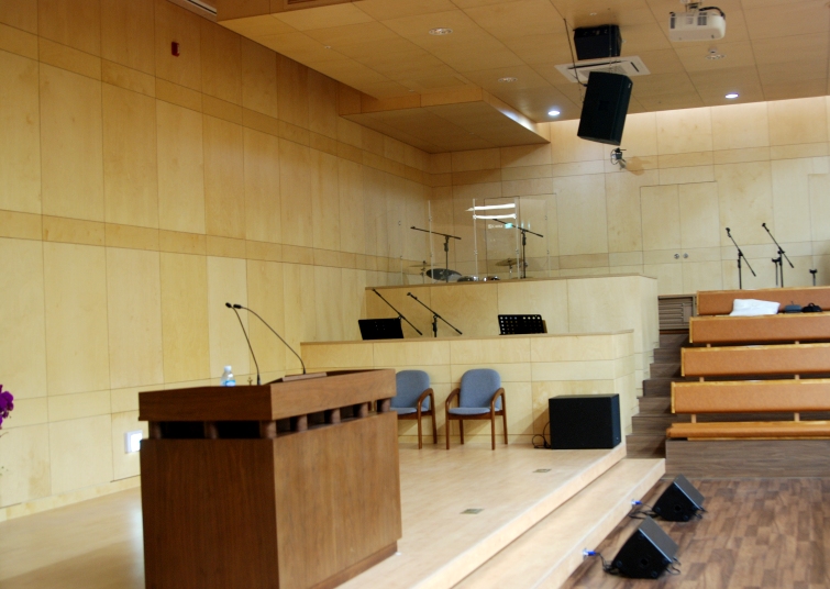 강대상 우편 상단에 따로 독립된 공간으로 확보하셔서 독특하고 효율적인 공간으로 배치 해 놓으셨습니다.