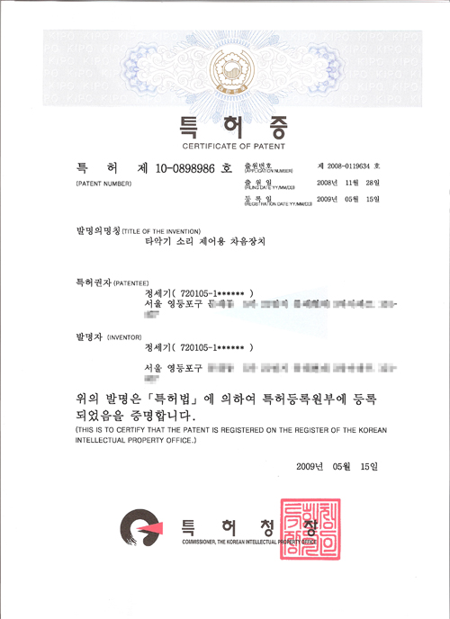 이번 5월 15일자로 특허 등록이 되었습니다.