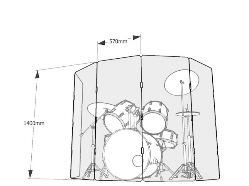한방향으로의 기본적인 드럼 주변 차음 효과, 쉴드 높이 140cm, 높은 투명도와 강도의 아크릴 판넬로 구성
